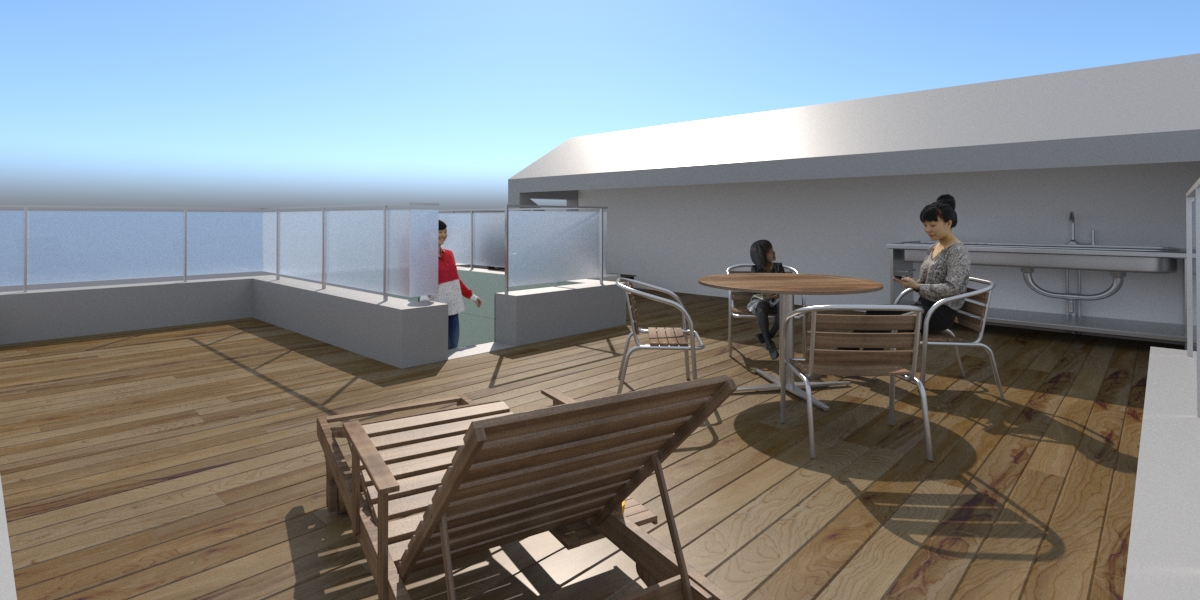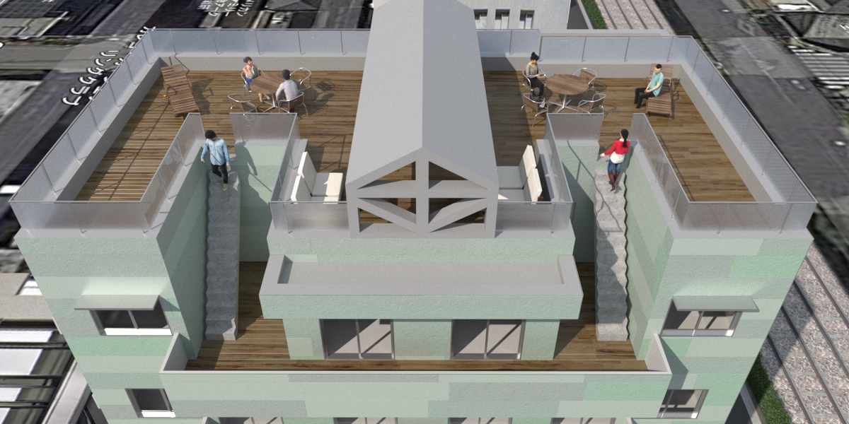 また、1階屋上の高さも低く設定したことで、「レストラン・カフェ」・「ルーフガーデン」が「キャンパス・コモン」から連続した一体の広場として利用できるように意図している。