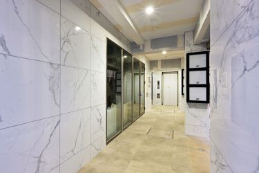3Fは応接室兼事務室。内装は落ち着いたモノトーンとしながら、壁の一部にはラフなコテ塗り仕上げを採用した。