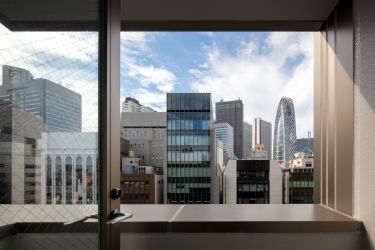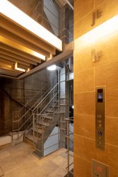 3Fは応接室兼事務室。内装は落ち着いたモノトーンとしながら、壁の一部にはラフなコテ塗り仕上げを採用した。