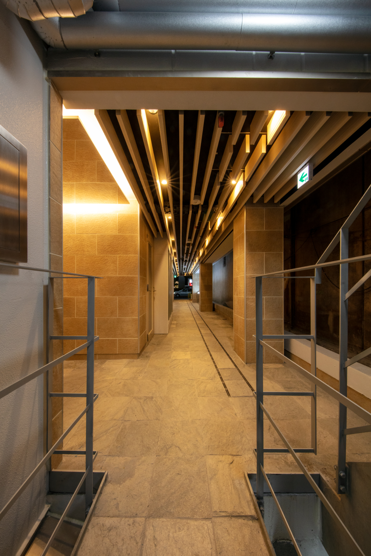 これらの解決方法として、コンクリートの擁壁と木造が地中で一体となった建物を採用した。
